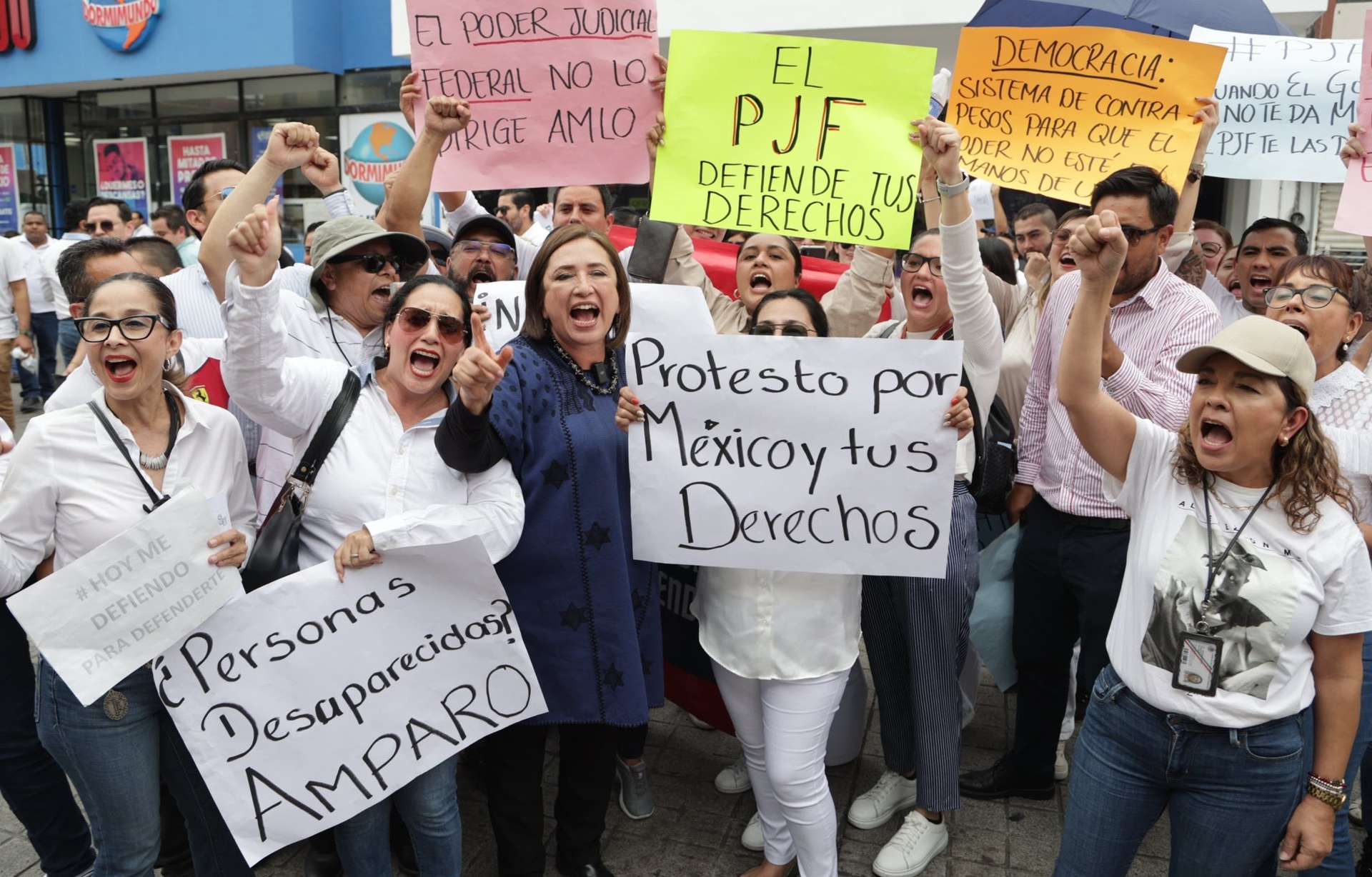 La aspirante del frente amplio por México, Xóchitl Gálvez, mostró su apoyo a los trabajadores del poder judicial, salió del Senado de la República para dialogar con los afectados, quienes protestan en esta instancia legislativa en contra de la extinción de fideicomisos, con lo que, denuncian se transgreden sus derechos laborales. de igual manera explicó que el PRI, PAN y PRD está de su lado y se buscará cuidar todos sus derechos y bienestar.