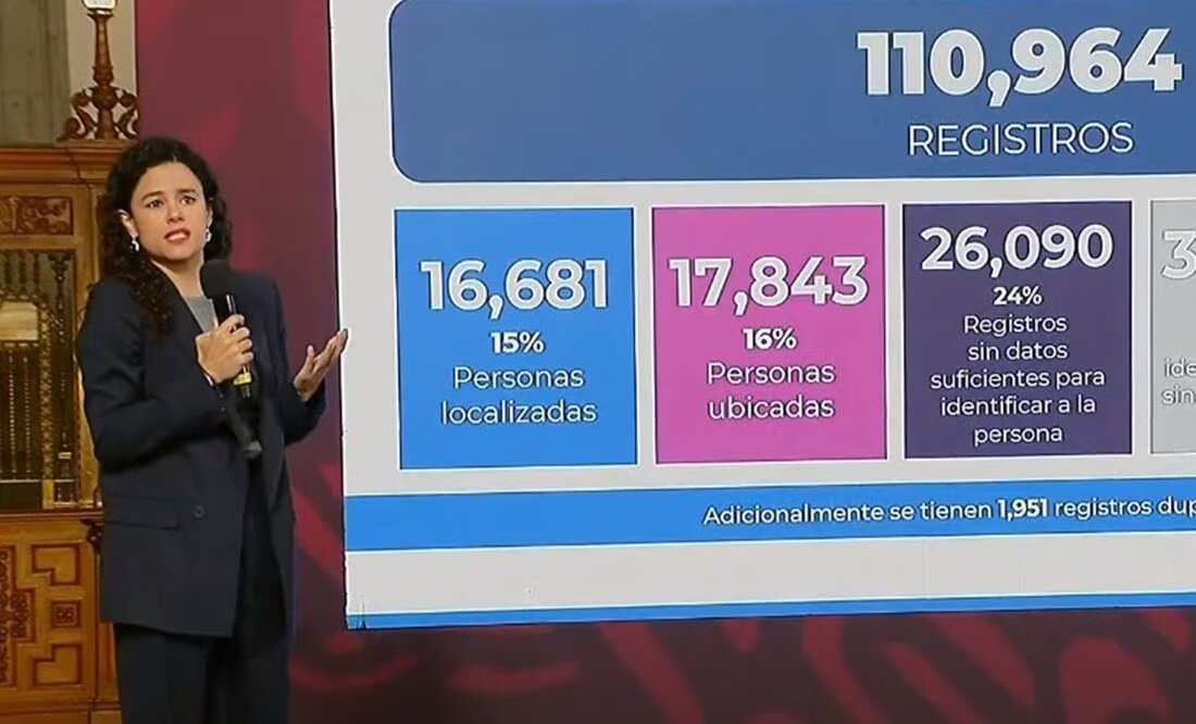 Luisa María Alcalde explicó que en el registro hay 110 mil 964 personas desaparecidas hasta el 22 de agosto de este año. De esta manera, Alcalde Luján reiteró que aunque sean localizados no se han borrado ni se borrará ningún registro de personas desaparecidas.