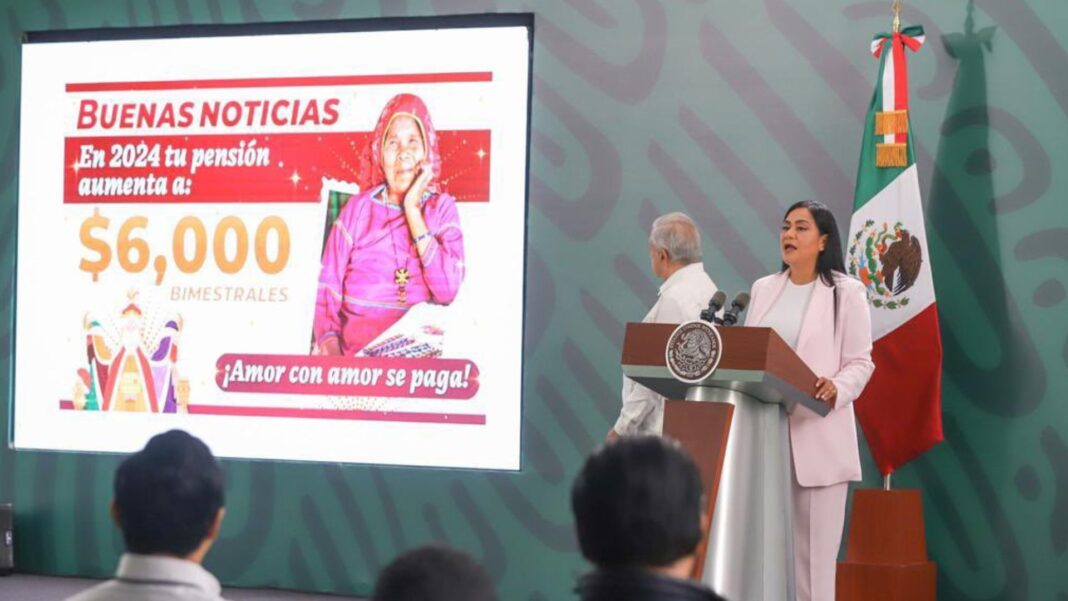 Ante los medios de comunicación, la secretaria de Bienestar, Ariadna Montiel, dio a conocer que a partir de este 2024 las personas adultas mayores recibirán 6 mil pesos bimestrales, el pago se llevará a cabo el día miércoles 3 de enero a 12 millones 101 mil personas adultas mayores, con una inversión social de 465 mil 48 millones de pesos.