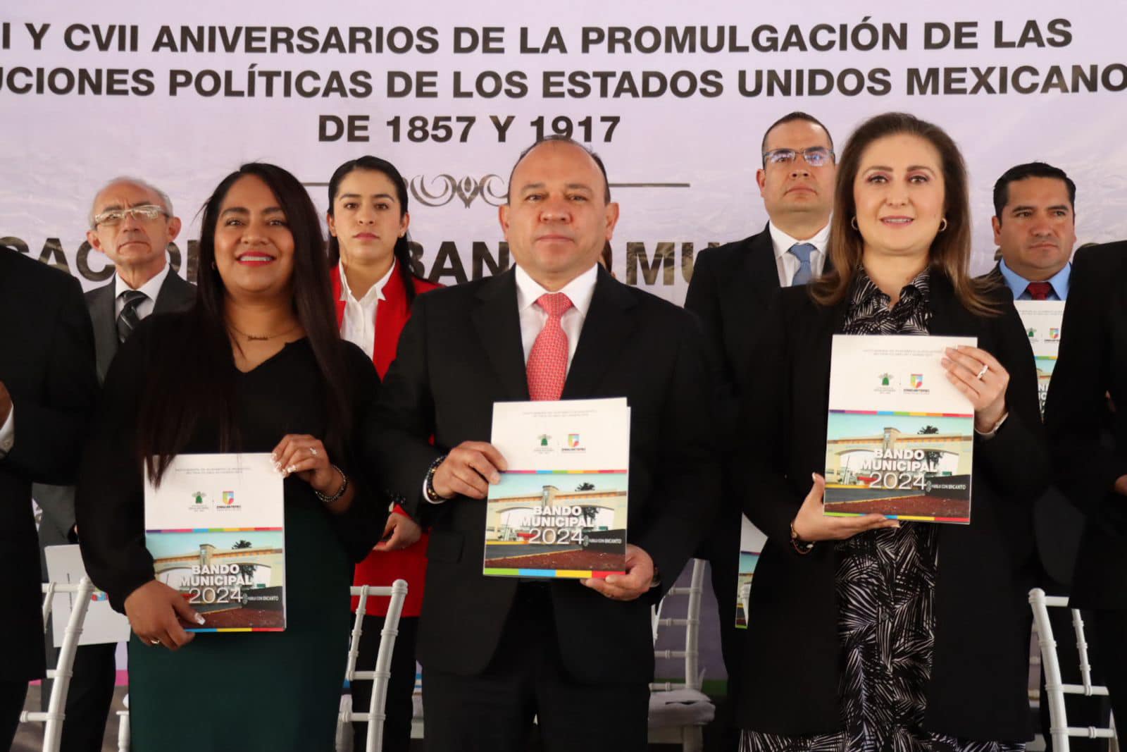 El presidente municipal Manuel Vilchis Viveros, encabezó la Ceremonia Conmemorativa por el 107 Aniversario de la Promulgación de la Constitución de los Estados Unidos Mexicanos y publicó el Bando Municipal 2024, documento normativo del territorio municipal, que contiene los derechos y obligaciones de la ciudadanía, así como las reglas y estatutos que rigen la prestación de servicios del gobierno de #Zinacantepec para todas las comunidades.