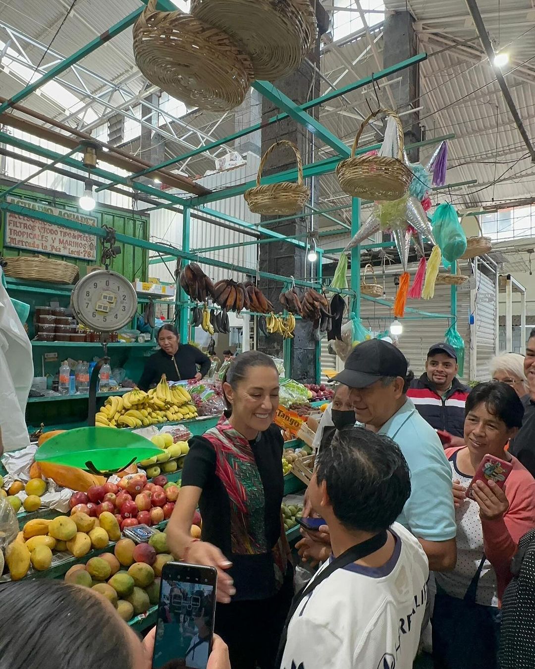 Acompañada de su equipo, Sheinbaum recorrió los pasillos del mercado saludando a los comerciantes y vecinos del lugar. Entre sonrisas y saludos, expresó su alegría por tener la oportunidad de encontrarse con la gente que representa, mencionando: «Antes de llegar a la oficina pasé al mercado de Tlalpan a comprar unos mangos, me dio mucho gusto saludar a mis vecinos».