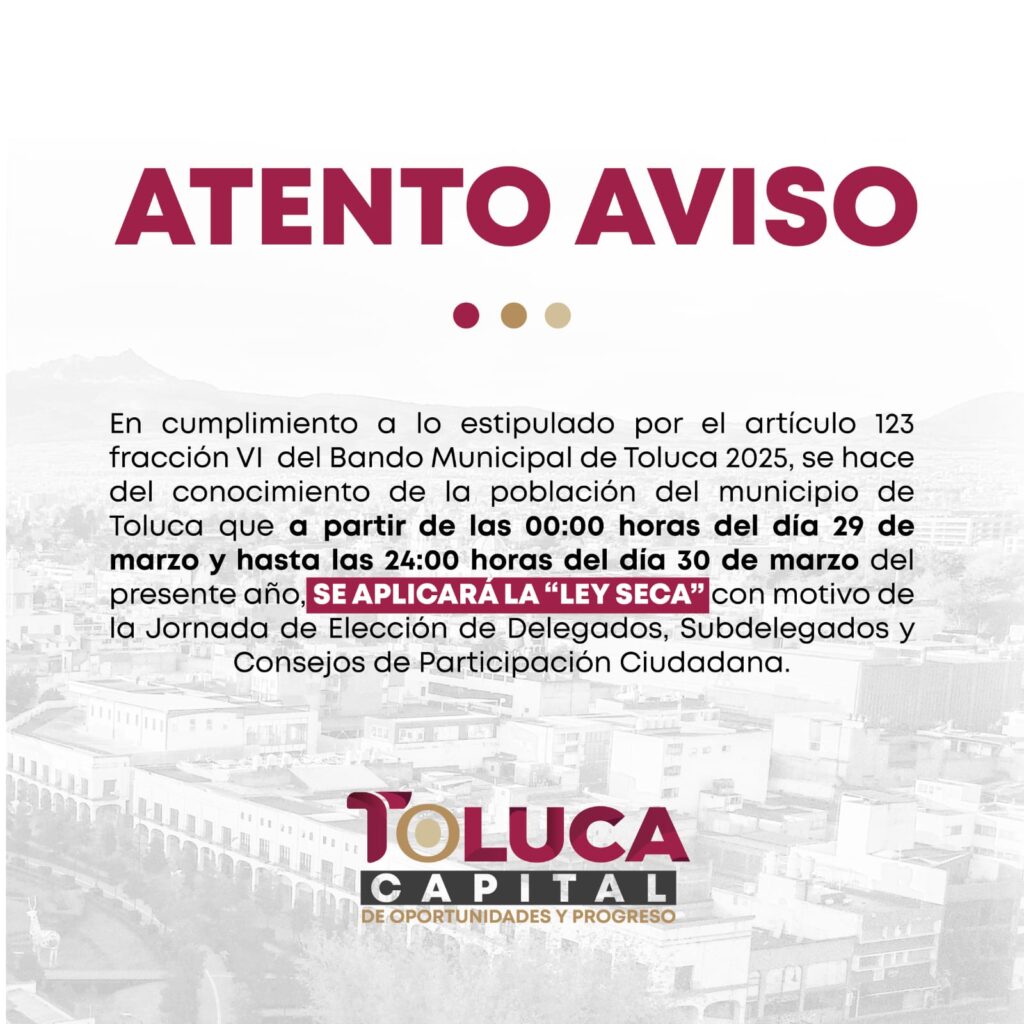 El gobierno municipal de Toluca ha anunciado la implementación de la Ley Seca durante la Jornada de Elección de Delegados, Subdelegados y Consejos de Participación Ciudadana, que se llevará a cabo este fin de semana. La restricción, que estará vigente en todas las delegaciones y subdelegaciones de la ciudad, comenzará a las 00:00 horas del sábado 29 de marzo y finalizará a las 24:00 horas del domingo 30 de marzo. Esta medida se realiza en cumplimiento del artículo 123 del Bando Municipal 2025, el cual prohíbe la venta o suministro de bebidas alcohólicas durante la jornada electoral y el día anterior.