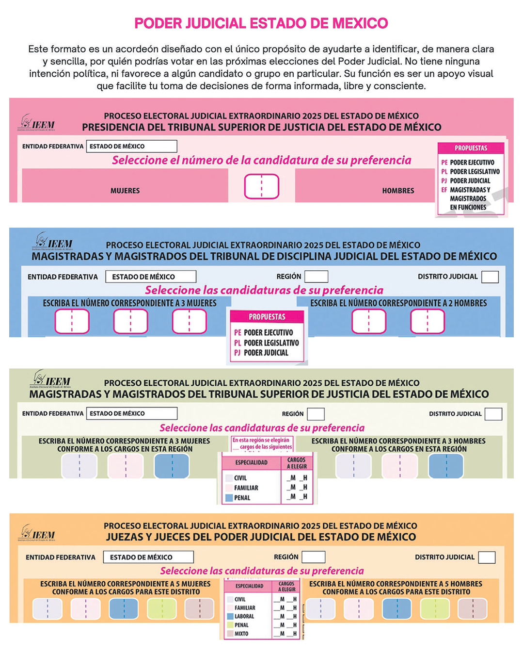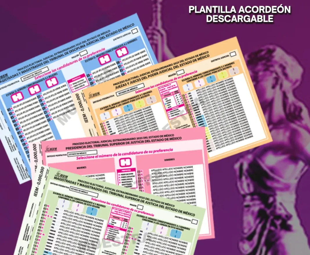 Rotativo de México diseñó un acordeón descargable para facilitar la participación ciudadana en las elecciones del Poder Judicial del Estado de México, que se llevarán a cabo el 1 de junio. Este documento puede imprimirse y llenarse con los nombres de los candidatos elegidos, permitiendo a los votantes llevarlo consigo y hacer más ágil su proceso de votación. La iniciativa es completamente ciudadana y sin fines políticos. El enlace para descargar la plantilla está disponible en nuestras historias.