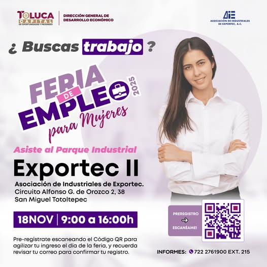 La funcionaria informó que el evento se llevará a cabo el próximo 18 de noviembre en el Parque Industrial Exportec II, a partir de las 8:30 de la mañana. Las interesadas podrán registrarse previamente a través del formulario disponible en la página institucional de@H.AyuntamientoDeToluca.