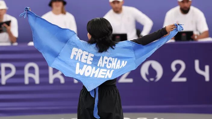 Manizha Talash, conocida como “b-girl Talash” y miembro del equipo de refugiados, fue descalificada de París 2024 en la primera competencia olímpica de breaking tras portar una capa con la frase “Mujeres Afganas Libres” durante su enfrentamiento preclasificatorio contra India Sardjoe, conocida como “b-girl India”.