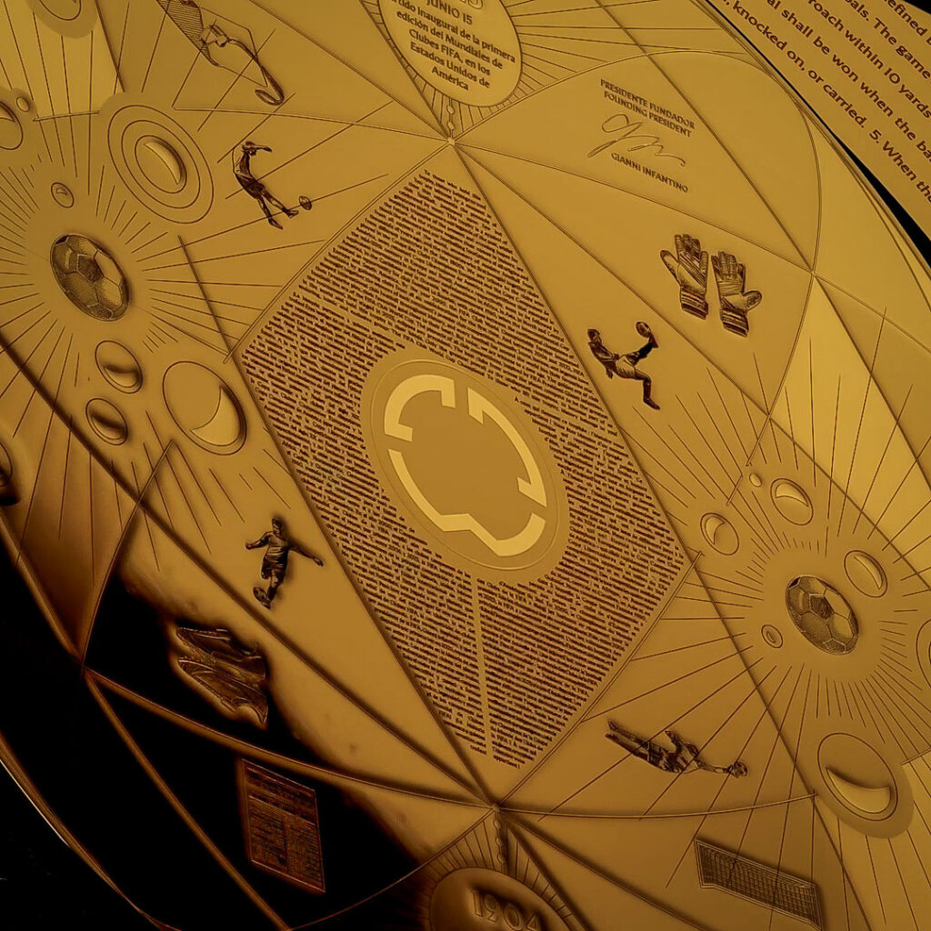 Inspirado en los discos dorados que la NASA envió al espacio en 1970, el diseño del trofeo destaca por su mensaje universal y su enfoque en la conexión global. Las inscripciones se encuentran en trece idiomas diferentes, simbolizando el alcance global y la inclusión que caracterizan al fútbol.