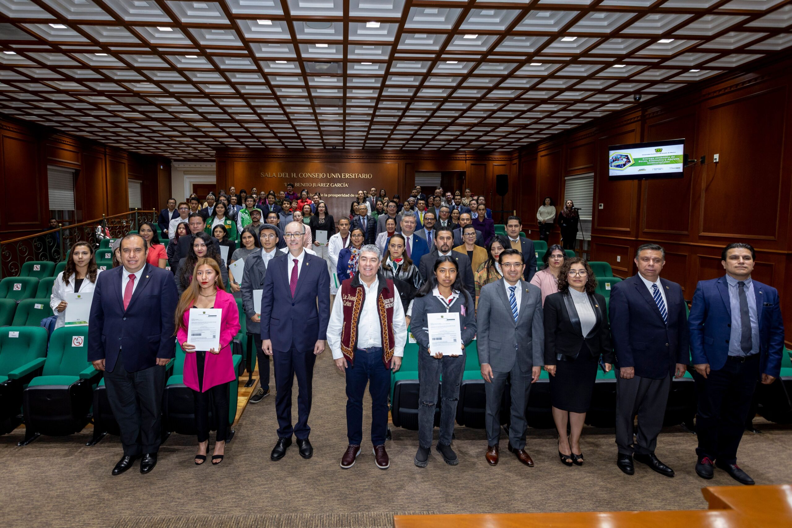 La UAEMex hizo entrega simbólica de 23 apoyos de un total de 14 mil 690 becas y estímulos que beneficiarán al estudiantado de los niveles medio superior, superior y estudios avanzados de la Autónoma mexiquense.