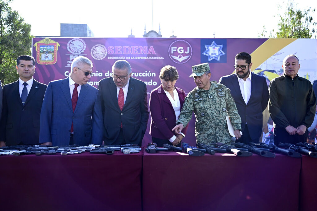Al término de la ceremonia cívica en la Plaza de los Mártires, la Gobernadora Delfina Gómez Álvarez fue testigo de la destrucción de 54 armas cortas y 28 largas, las cuales fueron aseguradas por los tres órdenes de gobierno.