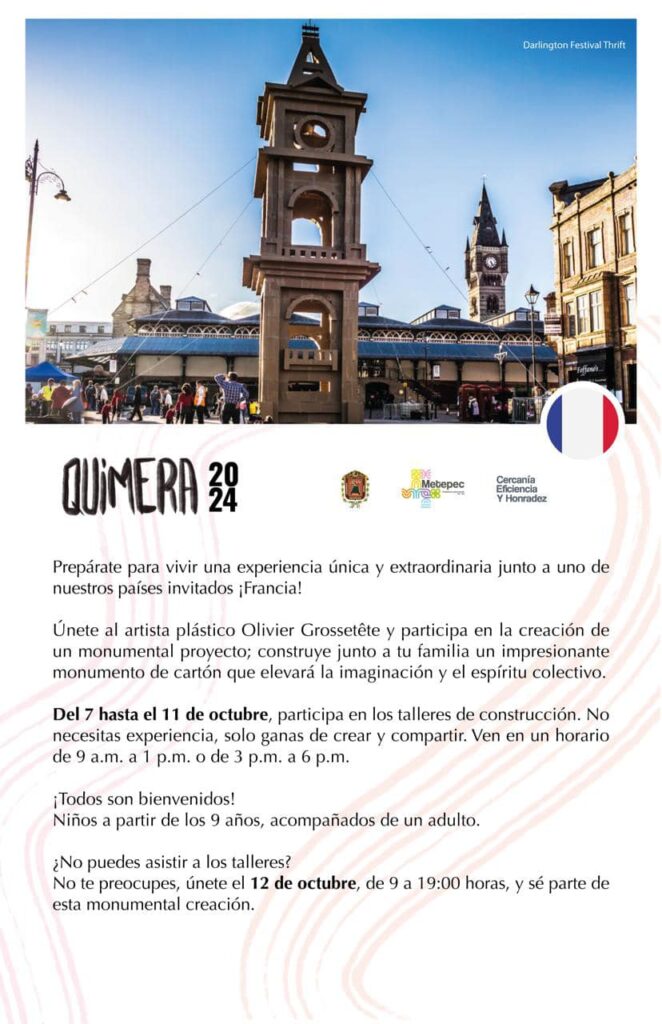 El Festival Quimera 2024 en Metepec se alista para celebrar su 34ª edición, con más de 100 actividades artísticas, culturales y recreativas. Este año, el evento se llevará a cabo del 10 al 20 de octubre, con Francia como país invitado, lo que traerá diversas expresiones culturales galas al pueblo mágico de Metepec.