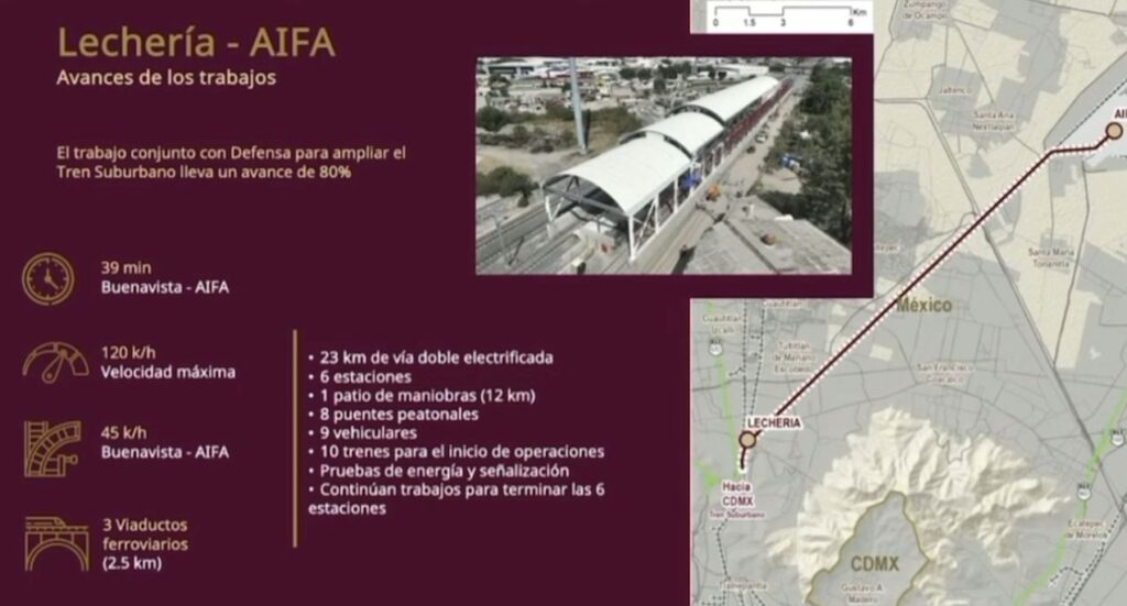 El Tren Suburbano Lechería-AIFA contará con 10 trenes que iniciarán operaciones con una velocidad máxima de 120 km/h, permitiendo a los usuarios un transporte rápido y eficiente. Con este avance, se espera que la infraestructura contribuyan a mejorar la calidad de vida de los habitantes de la Zona Metropolitana y de quienes utilicen el Aeropuerto Internacional Felipe Ángeles.