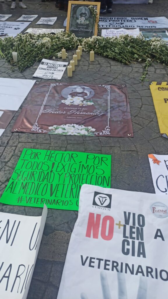 Los manifestantes, vestidos con batas blancas y moños negros en señal de luto, portaron pancartas con mensajes como “¡Justicia para Héctor!” y “No más violencia contra veterinarios”. Durante el recorrido, expresaron su indignación por el creciente número de agresiones hacia el gremio, que incluyen amenazas, extorsiones e incluso ataques físicos.