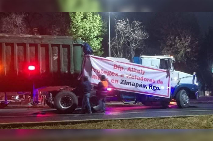 Los manifestantes colocaron camiones de carga atravesados en la vialidad y desplegaron mantas en las que solicitan acción inmediata contra Arturo Williams Trejo Leal y Bertha Eva Medina Hernández, quienes fueron liberados en diciembre de 2023 tras ser acusados de agredir a sus sobrinas de 8 y 10 años.