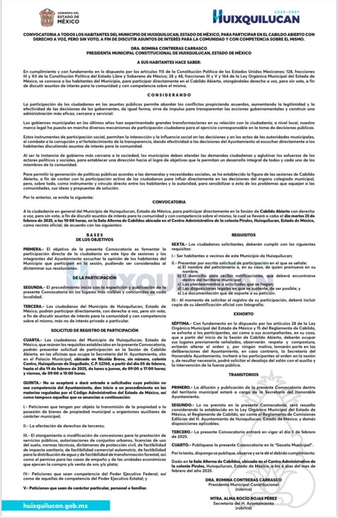 La presidenta municipal de Huixquilucan, Romina Contreras Carrasco, encabezó la primera sesión del Cabildo Abierto, un mecanismo que permite a la ciudadanía presentar propuestas para mejorar su comunidad. Durante la Séptima Sesión Ordinaria, destacó la importancia de escuchar las demandas de los habitantes y transformar sus ideas en políticas públicas que favorezcan el desarrollo del municipio.