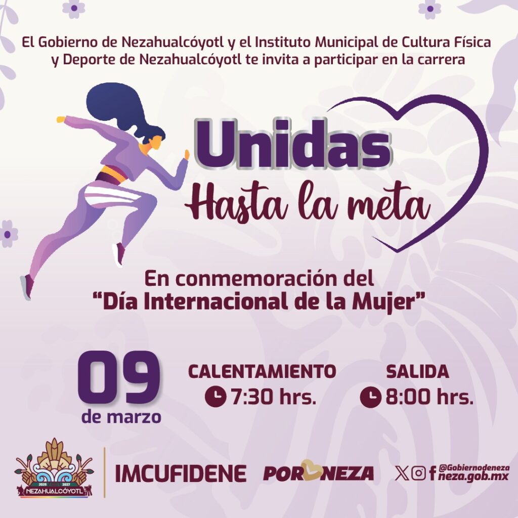 El municipio de Nezahualcóyotl y el Instituto Municipal de Cultura Física y Deporte (Imcufidene) llevarán a cabo la carrera femenil “Unidas hasta la meta” el próximo 9 de marzo. Esta actividad busca honrar a las mujeres que promueven la equidad de género y luchan contra la violencia y la discriminación.