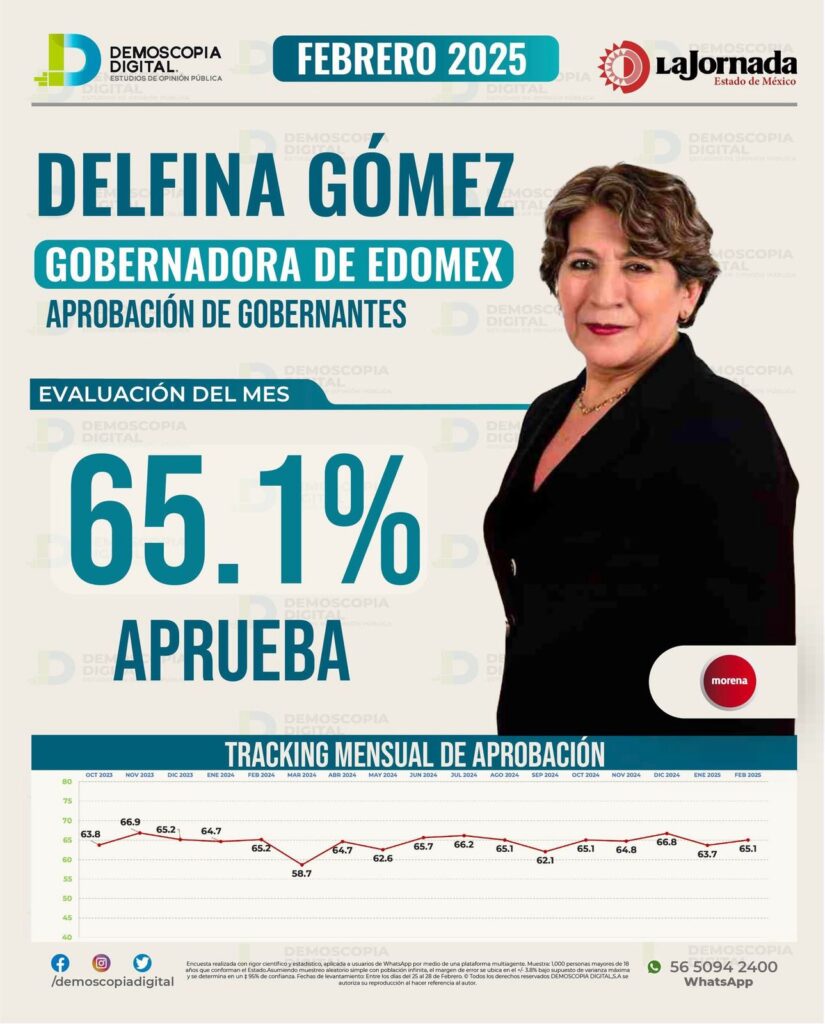 La gobernadora del Estado de México, Delfina Gómez Álvarez, mantiene un 65.1% de aprobación, según Demoscopia Digital, ubicándose entre los cuatro mandatarios mejor evaluados del país. Su administración ha destacado por atender a sectores históricamente rezagados, lo que ha fortalecido su respaldo ciudadano.