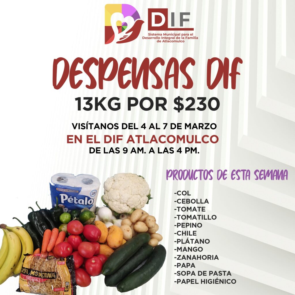 A partir del miércoles 5 de febrero a las 12:00 horas, las despensas estarán disponibles para toda la comunidad en las instalaciones del DIF Atlacomulco. Cada paquete tiene un costo de $230 pesos e incluye: