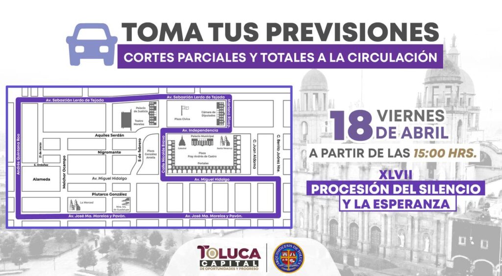 El próximo viernes 18 de abril, a partir de las 15:00 horas, se implementará un operativo vial en el Centro Histórico de Toluca con motivo de la Procesión del Silencio y la Esperanza, organizada por la Arquidiócesis de Toluca.