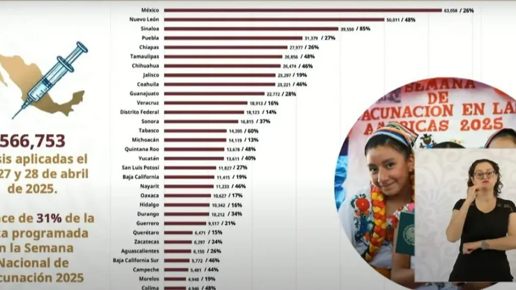 El Estado de México encabeza los avances nacionales en la Semana Nacional de Vacunación 2025, al registrar la mayor cantidad de dosis aplicadas en todo el país, según informó el subsecretario de Prevención y Promoción de la Salud, Ramiro López Elizalde, durante la conferencia matutina encabezada por la presidenta Claudia Sheinbaum.