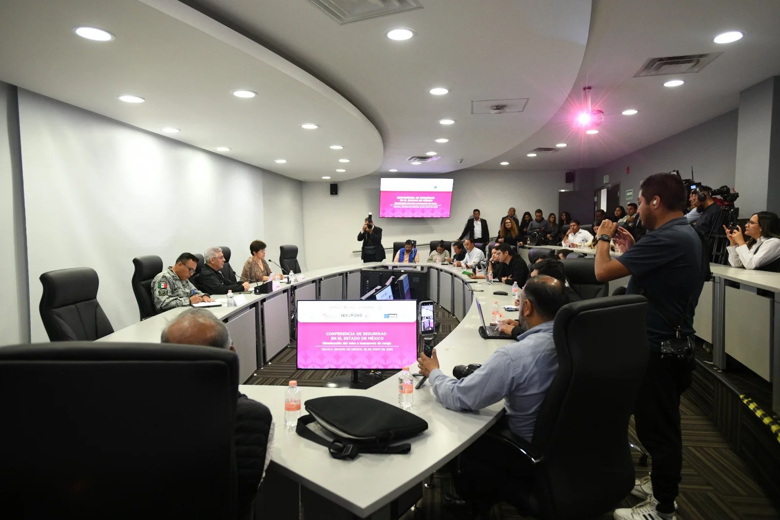 Durante una conferencia de prensa, Castañeda Camarillo detalló que, desde septiembre de 2023 hasta abril de 2025, los eventos de robo con violencia a transportistas pasaron de 316 a 175 casos mensuales. Además, se recuperaron mil 447 unidades de transporte de carga con reporte de robo vigente y se aseguraron 829 cajas, remolques y montacargas.