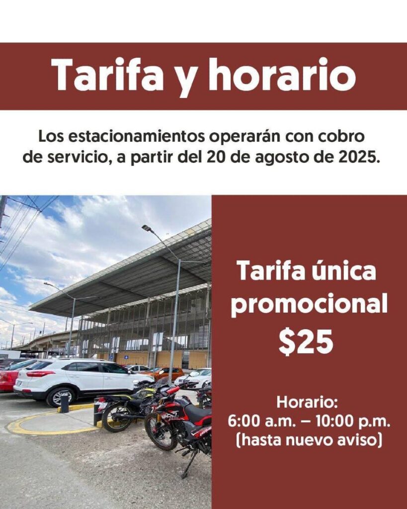 El cobro aplicará en los estacionamientos de Zinacantepec, Lerma y Metepec, con una tarifa de 25 pesos por vehículo, vigente de 6:00 a 22:00 horas hasta nuevo aviso. Los usuarios deberán considerar este gasto adicional al precio del boleto al planear sus viajes.