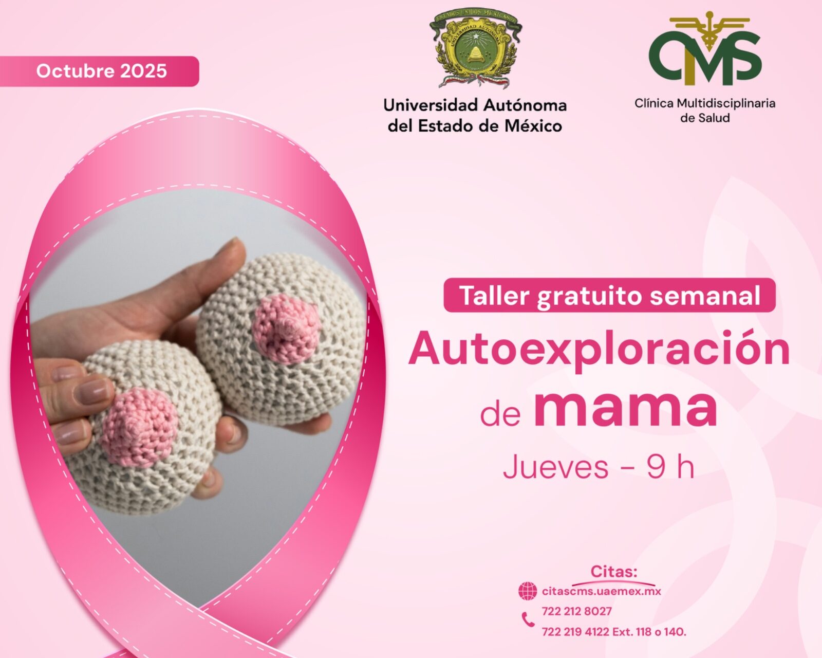 El próximo 19 de octubre se conmemora el Día Mundial de la Lucha contra el Cáncer de Mama, un recordatorio de la importancia de la prevención y el diagnóstico temprano. Para facilitar el acceso a los servicios, la UAEMéx habilitó la página citas.cms.uaemex.mx y los números 📞 722 212 80 27 y 722 219 41 22, extensiones 118 y 140.