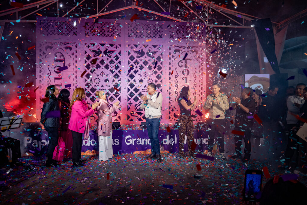 En el marco de la Feria y Festival Cultural del Alfeñique 2025, la capital mexiquense presentó el papel picado más grande del mundo, una obra monumental que mide más de tres metros de alto y casi cinco metros de ancho, creada por la artesana Andrea Lara Cuadros, y que será exhibida a partir del 16 de octubre en el Museo José María Heredia, frente al Panteón de La Soledad.
