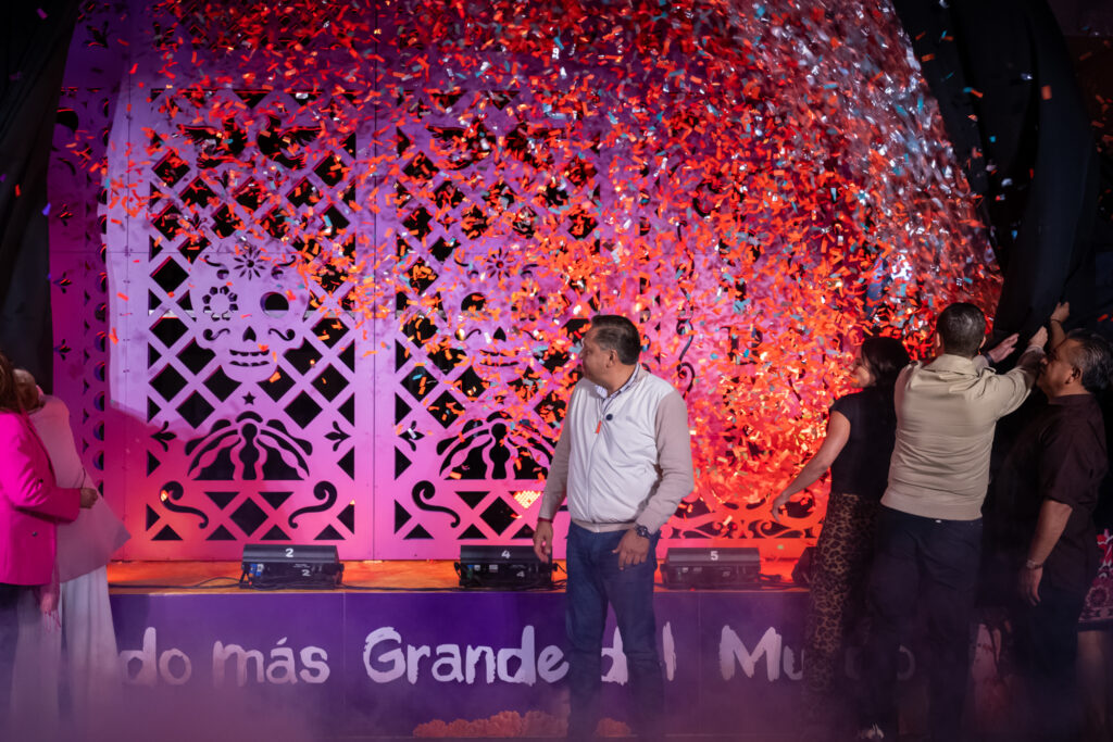 La pieza monumental recuerda uno de los símbolos más representativos del Día de Muertos, una tradición mexicana declarada Patrimonio Cultural Inmaterial de la Humanidad por la UNESCO. Con diseños de calaveras, esqueletos y flores de cempasúchil, el papel picado simboliza el ciclo entre la vida y la muerte.