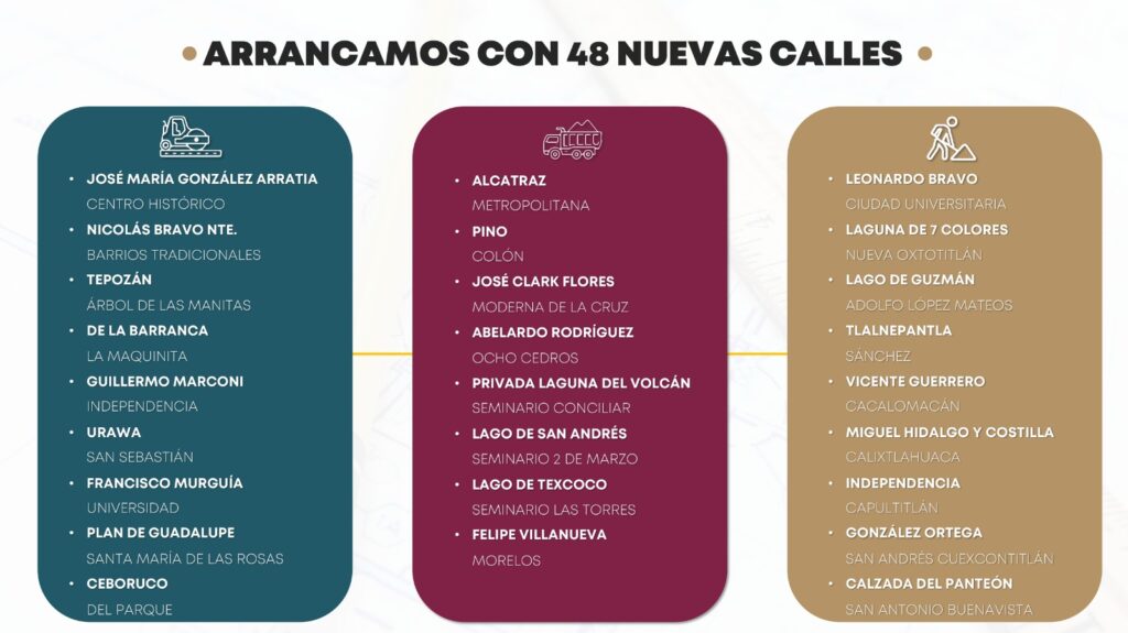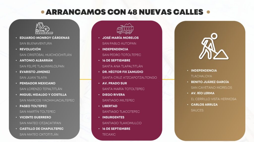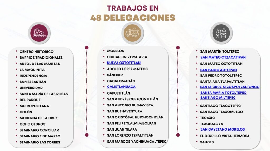 El arranque de los trabajos se realizó de manera simultánea en las 48 delegaciones del municipio, mediante enlaces en vivo que permitieron constatar las labores en puntos como La Maquinita, Calixtlahuaca, San Buenaventura, San Lorenzo Tepaltitlán, San Mateo Otzacatipan, Ciudad Universitaria, Morelos, Capultitlán, Seminario, Santa Ana Tlapaltitlán y Del Parque. En cada ubicación, las cuadrillas especializadas detallaron los procesos de bacheo que incluyen identificación del bache, corte, demolición y limpieza de la caja, colocación de liga y asfalto, y compactación, siguiendo estrictamente las normas de la SCT.