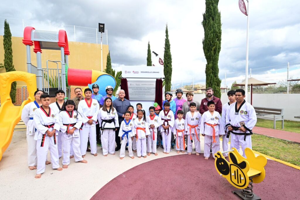 La Gobernadora Delfina Gómez Álvarez entregó la rehabilitación integral de la Unidad Deportiva “Manager Guadalupe Sánchez”. Esta es una obra social estratégica que recupera espacios públicos. Además fortalece la convivencia comunitaria y beneficia directamente a cerca de tres mil habitantes del municipio.