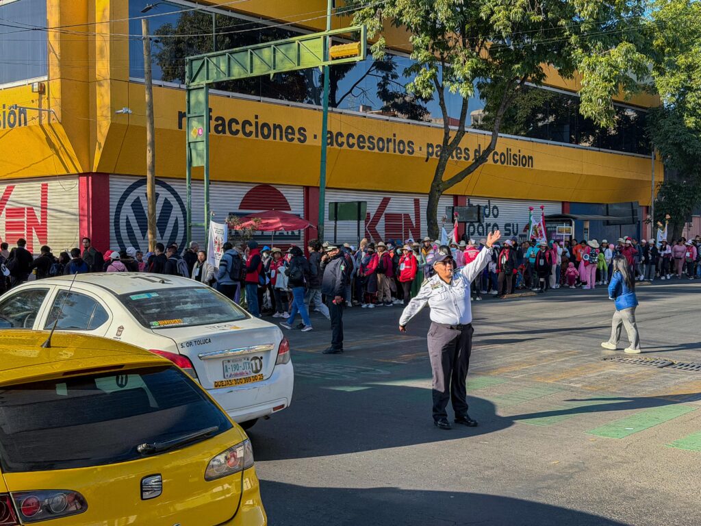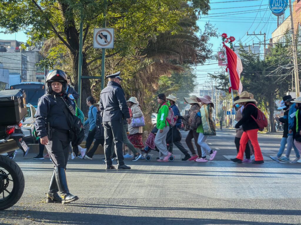 Para resguardar el paso de los peregrinos, la Dirección General de Seguridad y Protección desplegó un estado de fuerza integrado por 400 elementos. También destinó patrullas y motocicletas que acompañaron a los contingentes durante su recorrido por la capital mexiquense. La Policía Municipal realizó labores de abanderamiento y cortes momentáneos a la circulación cuando fue necesario. De este modo, se buscó prevenir accidentes y facilitar el avance ordenado de las columnas de fieles hasta su salida del territorio municipal.