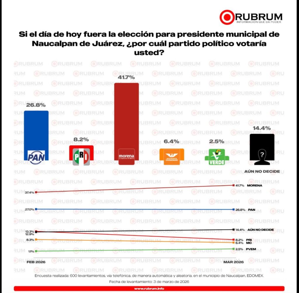 Según la medición más reciente, la aprobación hacia el actual alcalde continúa creciendo. En febrero el porcentaje se encontraba un punto por debajo, lo que indica una evolución positiva en la percepción ciudadana sobre su gestión. Este comportamiento refleja un panorama político en el que las administraciones vinculadas a Morena mantienen una base de apoyo sólida en distintos municipios del Estado de México, particularmente en zonas estratégicas como Naucalpan de Juárez.