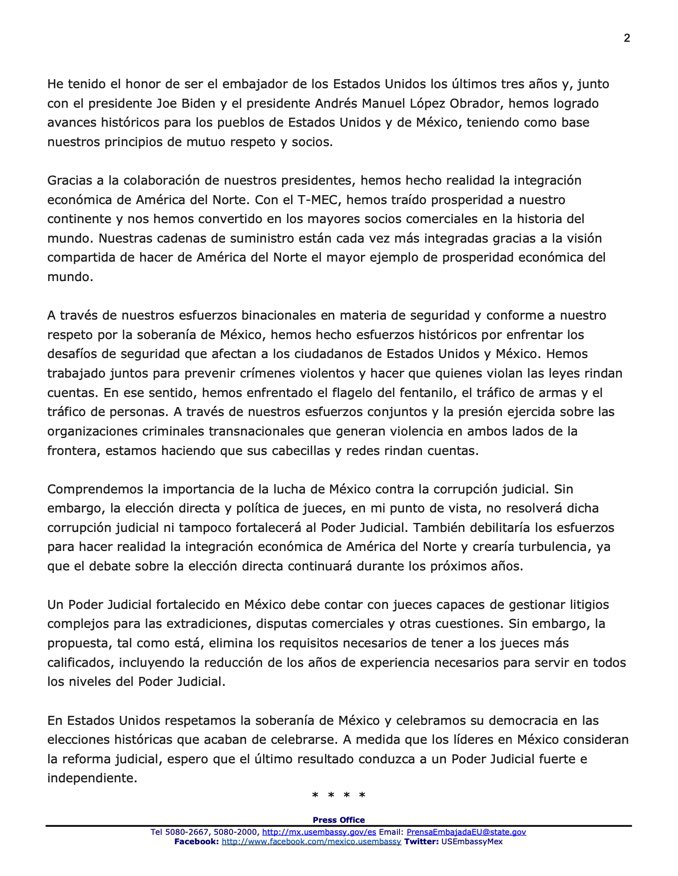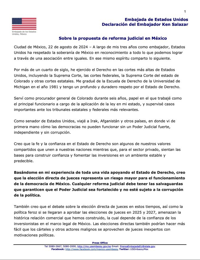 El embajador también cuestionó si la propuesta realmente abordará la corrupción en el sistema judicial, uno de los principales objetivos del presidente Andrés Manuel López Obrador. Advirtió que la politización de la elección de jueces es un riesgo significativo, ya que podría socavar la independencia del poder judicial y, en última instancia, afectar el sistema de justicia en el país.