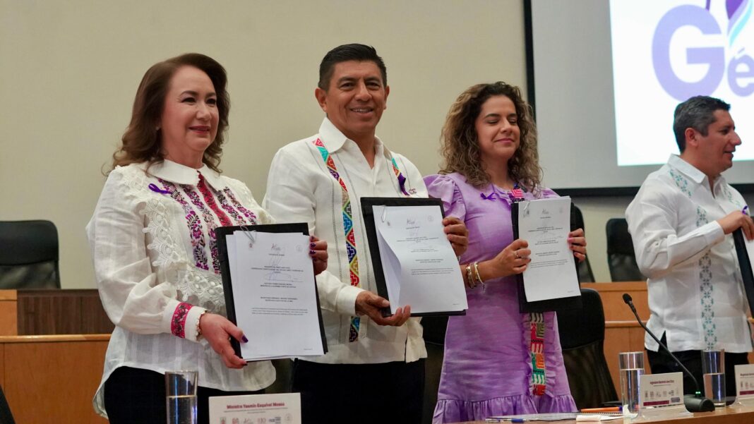 Yasmín Esquivel Mossa, Ministra de la Suprema Corte de Justicia de la Nación (SCJN); el Gobernador Constitucional del estado de Oaxaca, Salomón Jara Cruz y la Magistrada Berenice Ramírez Jiménez, Presidenta del Tribunal Superior de Justicia y del Consejo de la Judicatura del estado de Oaxaca, suscribieron el Convenio de Colaboración para la Implementación de las Líneas Estratégicas del Pacto Nacional por la Justicia de Género en Oaxaca.