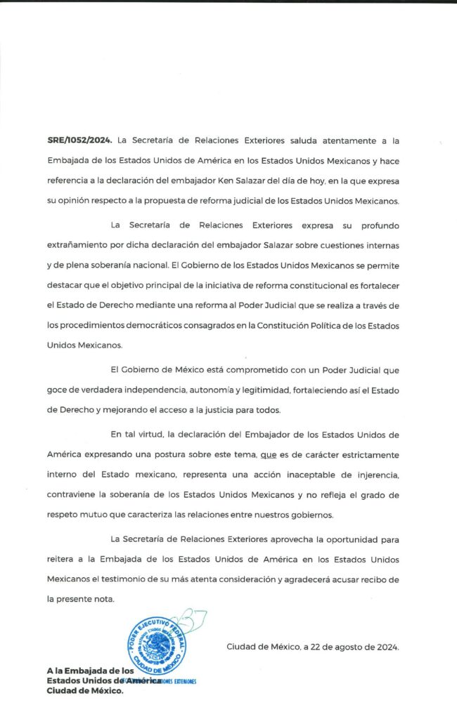 La nota diplomática enviada a la Embajada de Estados Unidos en México resalta que las declaraciones del embajador representan una acción inaceptable de injerencia en asuntos que competen únicamente al Estado mexicano, y que no reflejan el respeto mutuo que debe caracterizar las relaciones bilaterales entre ambos países.
