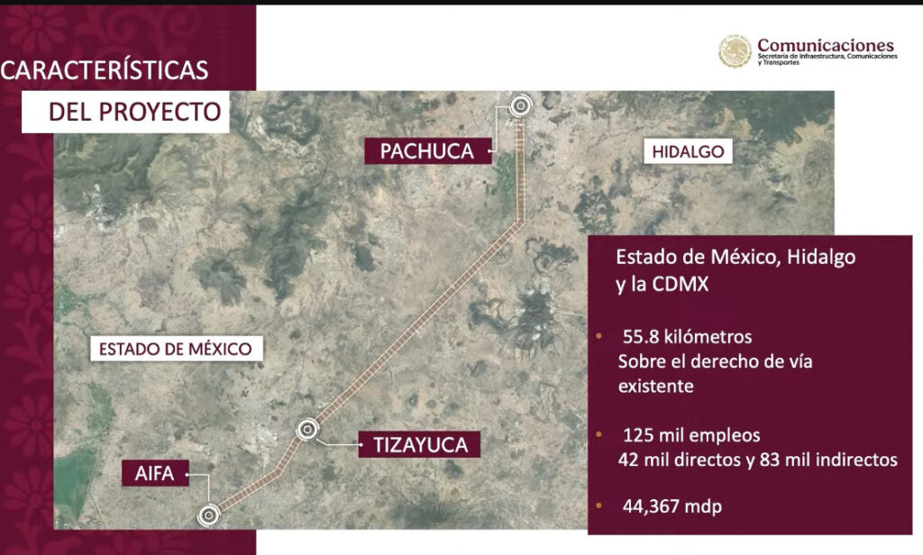 El trazado del tren abarcará 64 kilómetros y contará con una infraestructura ferroviaria de doble vía electrificada. Este nuevo sistema ferroviario promete reducir considerablemente los tiempos de viaje: el recorrido entre AIFA y Pachuca se disminuirá en un 50%, pasando de 40 a 20 minutos. Asimismo, el trayecto desde la Ciudad de México a Pachuca se acortará en un 25%, lo que permitirá un viaje de aproximadamente 30 minutos.