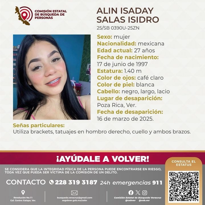 Alin, de 27 años, es descrita como una joven de estatura 1.40 metros, con piel clara, cabello negro y lacio, y tiene tatuajes en el hombro derecho, en ambos brazos y en el cuello. Además, se encuentra usando brackets. La Comisión Estatal de Búsqueda de Personas emitió una ficha con los datos de la joven y solicitó la colaboración de la sociedad para obtener cualquier información que ayude a su localización. El contacto para reportar información es el número 2283193187.