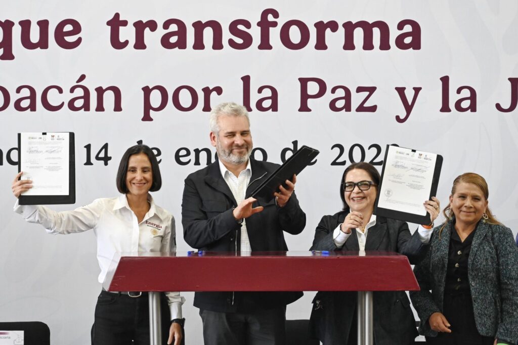 La secretaria de Energía, Luz Elena González Escobar, atestiguó la firma del convenio “Energía que Transforma”, suscrito por el gobernador Alfredo Ramírez Bedolla y la directora general de la CFE, Emilia Esther Calleja Alor, como parte del Plan Michoacán por la Paz y la Justicia, una estrategia integral que vincula desarrollo, bienestar y justicia social.