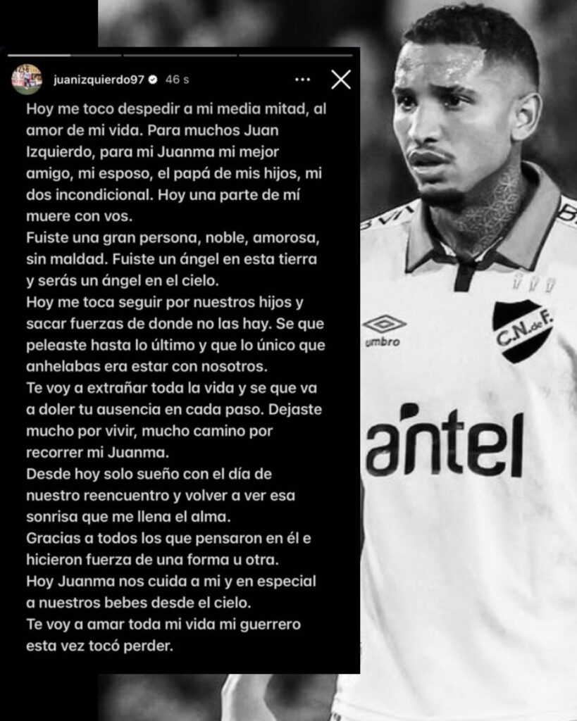 La muerte de Juan Izquierdo ha dejado un profundo dolor en su familia, especialmente en su esposa, quien en días anteriores había solicitado oraciones y apoyo para su esposo a través de redes sociales, destacando que el jugador acababa de convertirse en padre por segunda vez.