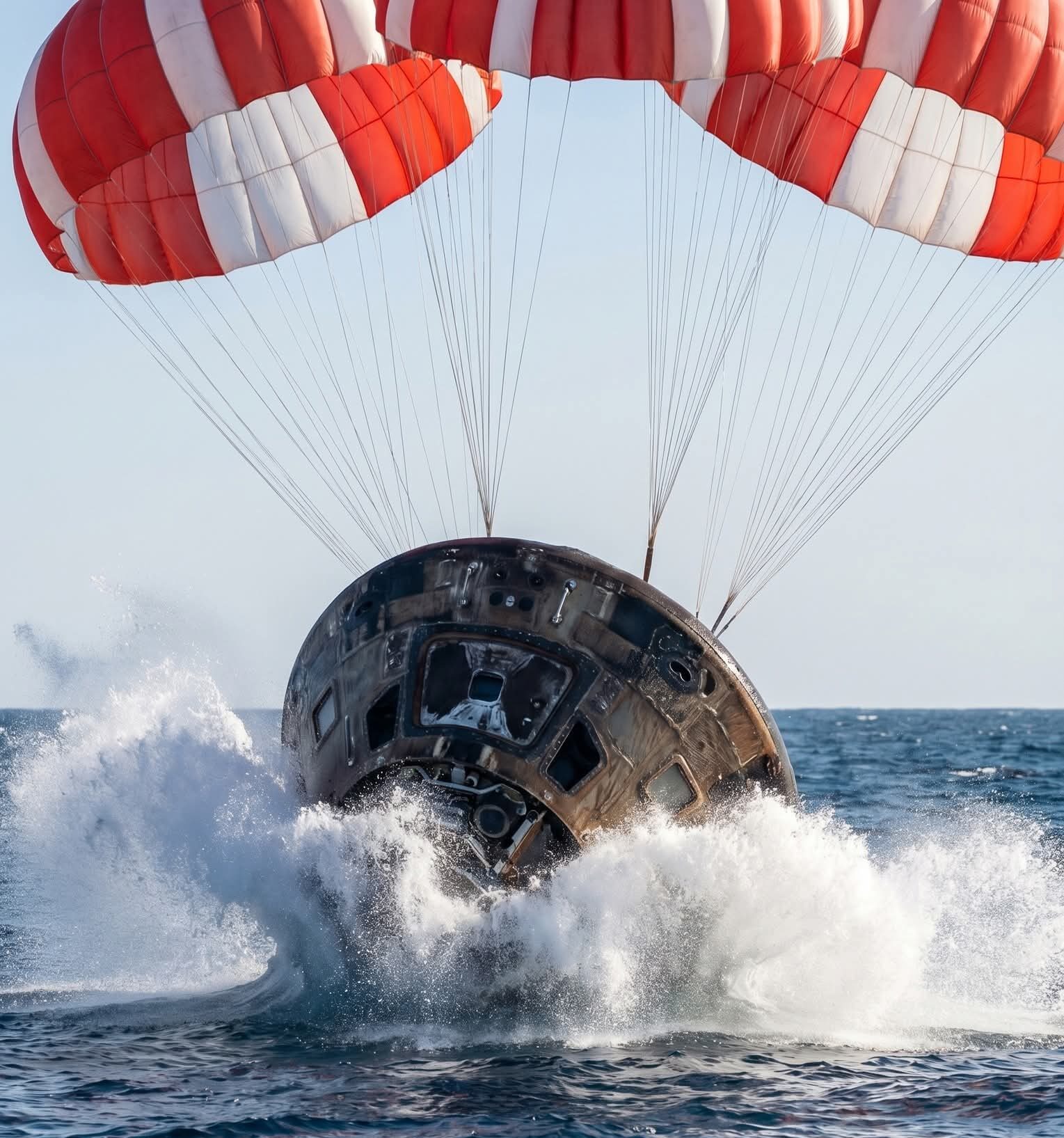 El retorno de la cápsula se produjo a velocidades cercanas a los 39,000 kilómetros por hora, generando una intensa fricción al reingresar a la atmósfera terrestre. Tras superar esta fase crítica, el sistema de paracaídas se desplegó con precisión, permitiendo un amerizaje controlado en aguas del océano frente a California.